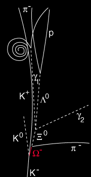 The Xi or "cascade" baryon was seen in the same reaction which led to the discovery of the omega-minus baryon at Brookhaven in 1964. At left is a sketch of the bubble chamber photograph in which the omega-minus baryon was discovered. The decay of the Xi indicated in the diagram is