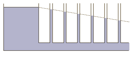 The flow in this system is from left to right, driven by a high pressure air supply. Note that the liquid level in the right hand tube is slightly higher, indicating that the pressure there is slightly less than that at the left hand tube. This is indicative of the normal pressure drop in a flowing fluid since the diameters of the top tube are the same at the left and right tubes. |