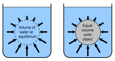 Archimedes' Principle The buoyant force on a submerged object is equal to the weight of the fluid displaced. This principle is useful for determining the volume and therefore the density of an irregularly shaped object by measuring its mass in air and its effective mass when submerged in water (density = 1 gram per cubic centimeter). This effective mass under water will be its actual mass minus the mass of the fluid displaced. The difference between the real and effective mass therefore gives the mass of water displaced and allows the calculation of the volume of the irregularly shaped object (like the king's crown in the Archimedes story). The mass divided by the volume thus determined gives a measure of the average density of the object. Archimedes found that the density of the king's supposedly gold crown was actually much less than the density of gold -- implying that it was either hollow or filled with a less dense substance. ![]() Examination of the nature of buoyancy shows that the buoyant force on a volume of water and a submerged object of the same volume is the same. Since it exactly supports the volume of water, it follows that the buoyant force on any submerged object is equal to the weight of the water displaced. This is the essence of Archimedes principle. Application to determining density |