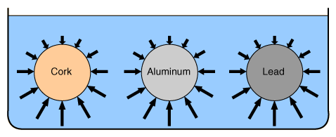 Equal Volumes Feel Equal Buoyant ForcesSuppose you had equal sized balls of cork, aluminum and lead, with respective specific gravities of 0.2, 2.7, and 11.3 . If the volume of each is 10 cubic centimeters then their masses are 2, 27, and 113 gm.![]() Each would displace 10 grams of water, yielding apparent masses of -8 (the cork would accelerate upward), 17 and 103 grams respectively. The behavior of the three balls would certainly be different upon release from rest in the water. The cork would bob up, the aluminum would sink, and the lead would sink more rapidly. But the buoyant force on each is the same because of identical pressure environments and equal water displacement. The difference in behavior comes from the comparison of that buoyant force with the weight of the object.