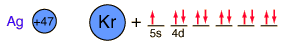 SilverSilver is a soft white metal which is denser than copper and has a lower melting point. It is used in coinage, tableware, and jewelry. In an amalgum with mercury, it is used for the fillings of teeth. A large amount of silver is used in photography. Coinage silver in the United States has been typically 90% silver and 10% copper. British sterling silver is 92.5% silver and 7.5% copper. The compound silver nitrate (AgNO3) is used to cauterize sores and wounds. It is easily converted to metallic silver by contact with organic matter, such as skin or cloth, and is used in making indelible ink. The silver ion makes an excellent antiseptic, so several silver compounds are used medically as germicidal agents. Fine grains of silver bromide suspended in a thin layer of gelatin forms a photographic emulsion. The emulsion is formed on a sheet of cellulose acetate. The silver bromide is light sensitive, and undergoes photochemical decomposition. The gelatin increases this light sensitivity, perhaps because of the sulfur in it. The decomposed silver bromide registers an image, and development with an alkaline solution of an organic reducing agent like hydroquinone causes the sensitized grains to be reduced to metallic silver, while unexposed grains remain unchanged. The undeveloped grains of silver bromide are removed by a fixing solution containing the thiosulfate ion, which forms the soluble silver thiosulfate complex. The negative can then be washed, leaving the silver image. Silver is sometimes found in nature in metallic form. It forms a sulfide mineral Ag2S called acanthite. Mineral forms of silver include sulfides formed with antimony called Stephanite, miargyrite and pyrargyrite. Silver joins with lead and antimony in the sulfide andorite, AgPbSb3S6. Silver with copper and antimony forms the sulfide polybasite. Silver with arsenic forms the sulfide proustite. In the mineral dyscrasite, silver bonds directly to antimony in the form Ag3Sb. Silver bonds to tellurium in the mineral hessite, Ag2Te. Silver appears in the chloride minerals boleite and chlorargyrite and the bromide mineral bromargyrite. Silver is one of the few exceptions to the general order of filling of electron orbitals like copper directly above it in the Periodic Table. It fills all ten 4d states before it fills the second 5s state. Just those levels outside a krypton core are shown. ![]()