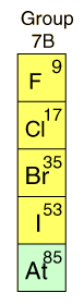 The elements of Group VII of the Periodic Table are called halogens, which means "salt formers". They lack only one electron to form a complete shell or subshell, and are extremely active chemically. Chemical activity increases as you move upward in the group, fluorine being the most active element in the Periodic Table.