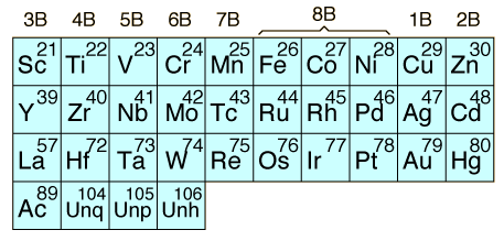 ![]() The transition elements are those elements having a partially filled d or f subshell in any common oxidation state. The term "transition elements" most commonly refers to the d-block transition elements. The 2B elements zinc, cadmium and mercury do not strictly meet the defining properties, but are usually included with the transition elements because of their similar properties. The f-block transition elements are sometimes known as "inner transition elements". The first row of them is called the lanthanides or rare earths. The second row consists of the actinides. All of the actinides are radioactive and those above Z=92 are manmade in nuclear reactors or accelerators. The general properties of the transition elements are