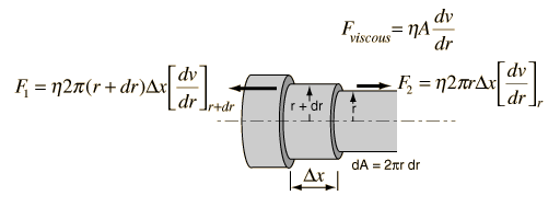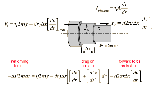 Velocity Relationship, Tube FlowThe nature of viscosity is such that successive lamina in the tube exert forces on each other according to the viscous force relationship: ![]() When a pressure gradient dP/dx drives a section of lamina of length Δx at constant velocity, the force equation takes the form: ![]()