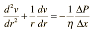 The general form of the solution to this differential equation is v = A + Br2 where A and B are constants which must be fit to the boundary condition of the flow: v=0 at r=R. Substituting the general solution by taking the derivatives gives: ![]()