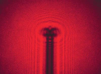 Diffraction by Pinhead![]() The beam of a laboratory helium-neon laser was spread with a telescope eyepiece and directed at the head of an ordinary straight pin. The diffraction pattern was photographed on a screen approximately four meters from the edge. Barrier diffraction must be handled by the techniques of Fresnel diffraction. One way to approach the calculation is by use of the Cornu spiral. |