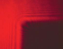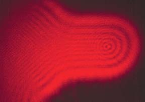 The beam of a laboratory helium-neon laser was spread with a telescope eyepiece and directed at machined metal edges. The diffraction pattern was photographed on a screen approximately four meters from the edge. This is diffraction from the corner of a double-edged razor blade. |