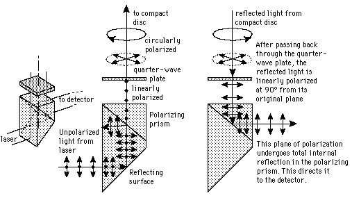 Compact Disc Optics![]() In a compact disc player, a polarizing prism and a quarter-wave plate route the reflected light signal to the detector. |