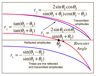Reflection and TransmissionTypical reflection and transmission curves for external reflection. These curves are the graphical representation of the Fresnel equations. Note that the reflected amplitude for the light polarized parallel to the incident plane is zero for a specific angle called the Brewster angle. The reflected light is then linearly polarized in a plane perpendicular to the incident plane. This polarization by reflection is exploited in numerous optical devices. ![]()
