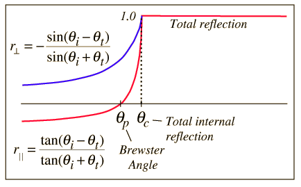 Internal Reflection CurvesThe illustration shows typical reflection curves for internal reflection. Internal reflection implies that the reflection is from an interface to a medium of lesser index of refraction, as from water to air. These curves are the graphical representation of the Fresnel equations. Note that the reflected amplitude for the light polarized parallel to the incident plane is zero for a specific angle called the Brewster angle. The reflected light is then linearly polarized in a plane perpendicular to the incident plane. This polarization by reflection is exploited in numerous optical devices. Another characteristic of internal reflection is that there is always an angle of incidence qc above which all light is reflected back into the medium. This phenomenon of total internal reflection has many practical applications in optics. ![]()