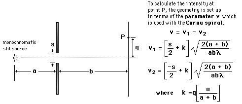 Fresnel GeometryFor the Fresnel case, all length parameters are allowed to take comparable values, so all must be included as variables in the problem. The usual geometry assumes a monochromatic slit source and the problem is set up in terms of a parameter v as defined below. This parameter is used with the Cornu spiral or a table of elliptical intgrals. ![]() |