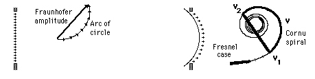 Fresnel v ParameterThe v-parameter in Fresnel diffraction analysis can be thought of as the arclength along the amplitude vector diagram called the Cornu spiral. In the Fraunhofer diffraction case where the source wavefront was assumed to be planar, the different elements of the wavefront had a constant phase difference and the incremental amplitude elements added to form the arc of a circle. In the Fresnel diffraction case where the curvature of the wavefront is included, the relative phase is not constant and the amplitude elements bend into the spiral curve. Just as in the Fraunhofer case, the resultant amplitude is represented by the chord of the arc. ![]() |