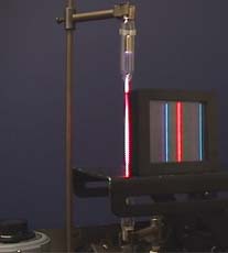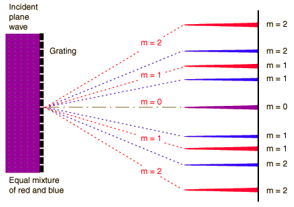 When light of a single wavelength , like the 632.8nm red light from a helium-neon laser at left, strikes a diffraction grating it is diffracted to each side in multiple orders. Orders 1 and 2 are shown to each side of the direct beam. Different wavelengths are diffracted at different angles, according to the grating relationship.