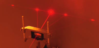 Diffraction Grating and Helium-Neon Laser![]() While directing the 632.8 nm red beam of a helium-neon laser through a 600 lines/mm diffraction grating, a cloud was formed using liquid nitrogen. You can see the direct beam plus the first and second orders of the diffraction. ![]() Another way to visualize the diffraction is to take a time exposure while sweeping a ground glass through the beams. This "paints in" the beams of the diffracted laser light. |