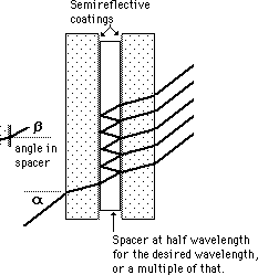 If a thin transparent spacer is placed between two semireflective coatings, multiple reflections and interference can be used to select a narrow frequency band, producing an interference filter. If the spacer is a half wavelength for the desired wavelength, then other wavelengths will be attenuated by destructive interference. Commercial filters are available with a half-power width of about an angstrom. If the back layer is totally reflective, then the arrangement is called a dichroic mirror, reflecting only the selected wavelength. These devices are designed for normal incidence, and shift in wavelength to shorter wavelengths if
