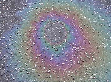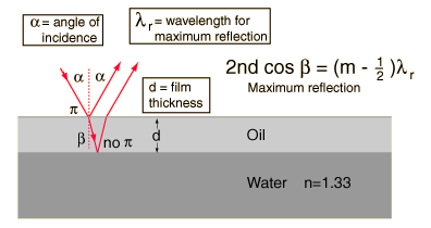 Oil Film InterferenceThe interference colors from an oil film on water can be related to the thickness of the film by using the interference condition and noting that there is a 180 degree phase change upon reflection from the film surface, but no phase change for the reflection from the back surface. This presumes that the index of refraction of the oil is greater than that of the water. The color seen depends also upon the angle of view. ![]() This is an exploratory calculation which will calculate the wavelengths for maximum reflection and transmission, the thickness of the film, or the angle of incidence. Enter the needed data and then click on the rectangle for the desired quantity in the active graphic above. Notes: The range of parameters which gives reflected or transmitted light in the visible range (roughly 400 to 700 nm) is very limited. If no parameters are entered, their values will default to incidence at 30°, n=1.42, and reflection in the green at 550 nm. All parameters may be changed, but calculated wavelengths outside the visible may not be at all reliable since the values usually given for indices of refraction are for the visible range only. If you see a visible color reflected from an oil film, you can get an approximate wavelength from a diagram of spectral colors, but there is no simple way to determine what order of reflection you are seeing.