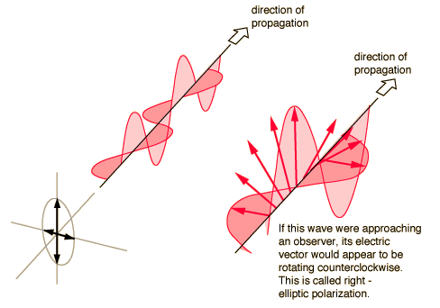 Elliptical PolarizationElliptically polarized light consists of two perpendicular waves of unequal amplitude which differ in phase by 90°. The illustration shows right- elliptically polarized light. ![]() If the thumb of your right hand were pointing in the direction of propagation of the light, the electric vector would be rotating in the direction of your fingers.