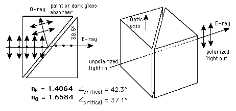 The Glan-Foucault prism achieves polarization by removing one plane of polarization by total internal reflection. It is made of two prisms of calcite with no other intervening material, i.e., with air between them. The O-ray is removed and the E-ray continues straight through the device as shown.