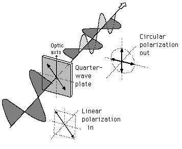 Quarter-Wave PlateA quarter-wave plate consists of a carefully adjusted thickness of a birefringent material such that the light associated with the larger index of refraction is retarded by 90° in phase (a quarter wavelength) with respect to that associated with the smaller index. The material is cut so that the optic axis is parallel to the front and back plates of the plate. Any linearly polarized light which strikes the plate will be divided into two components with different indices of refraction. One of the useful applications of this device is to convert linearly polarized light to circularly polarized light and vice versa. This is done by adjusting the plane of the incident light so that it makes 45° angle with the optic axis. This gives equal amplitude o- and e-waves. When the o-wave is slower, as in calcite, the o-wave will fall behind by 90° in phase, producing circularly polarized light.