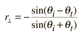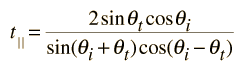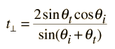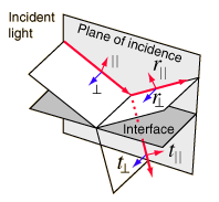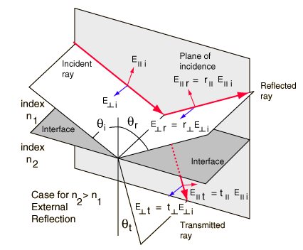 Fresnel's equations describe the reflection and transmission of electromagnetic waves at an interface. That is, they give the reflection and transmission coefficients for waves parallel and perpendicular to the plane of incidence. For a dielectric medium where Snell's Law can be used to relate the incident and transmitted angles, Fresnel's Equations can be stated in terms of the angles of incidence and transmission.