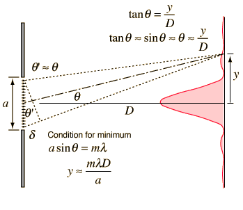 The active formula below can be used to model the different parameters which affect diffraction through a single slit. Enter the available measurements or model parameters and then click on the parameter you wish to calculate. This calculation is designed to allow you to enter data and then click on the quantity you wish to calculate in the active formula above. The data will not be forced to be consistent until you click on a quantity to calculate. Default values will be entered for unspecified parameters, but all values may be changed. Note: The small angle approximation was not used in the calculations above, but it is usually sufficiently accurate for laboratory calculations. |