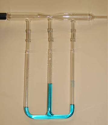 The fact that the center manometer has a higher level under these conditions of rapid air flow indicates that the pressure has been lowered in the constriction by the Bernoulli effect. Note that the liquid level in the right hand tube is slightly higher than the left tube, indicating that the pressure there is slightly less than that at the left hand tube. This is indicative of the normal pressure drop in a flowing fluid from Poiseuille's law since the diameters of the top tube are the same at the left and right tubes. Pressure Calculation |