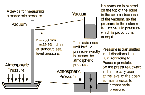 Mercury BarometerThe mercury barometer and other manometer devices are reliable pressure measurement devices since fluid pressure depends only on fluid density and depth. The atmospheric pressure provides the force necessary to push the mercury up the evacuated tube. Even though it acts downward in the illustration, by Pascal's principle we know that the pressure acts in all directions and can force the mercury up the tube until its weight is enough to equal the force of the atmosphere. ![]() |