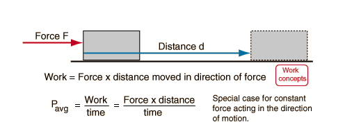 The rate of doing work is equal to the rate of using energy since the a force transfers one unit of energy when it does one unit of work. A horsepower is equal to 550 ft lb/s, and a kilowatt is 1000 watts. 1 hp = 745.8 watts. This calculation is only for cases where the force is in the direction of the velocity, and there are many cases where that is not so. Then for instantaneous power, you just multiply the product of force and velocity by the cosine of the angle between them to get the power. In the more general cases where everything varies, one often calculates the work first and then divides by the time to get the average power.