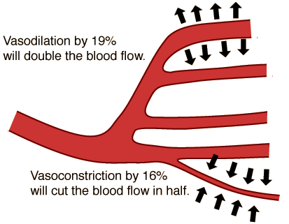 Poiseuille's law gives insight into the complex task of regulating blood flow to different parts of the body. In response to demand, the body must direct more oxygen and nutrients to one region of the body, and if necessary temporarily curtail the supply to a less essential region. Since the flow resistance depends upon the fourth power to the interior radius of a vessel, the processes of vasodilation and vasoconstriction offer powerful control mechanisms.