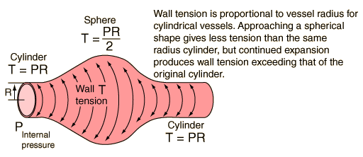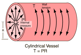 Tension in Arterial WallsThe tension in the walls of arteries and veins in the human body is a classic example of LaPlace's law. This geometrical law applied to a tube or pipe says that for a given internal fluid pressure, the wall tension will be proportional to the radius of the vessel.
