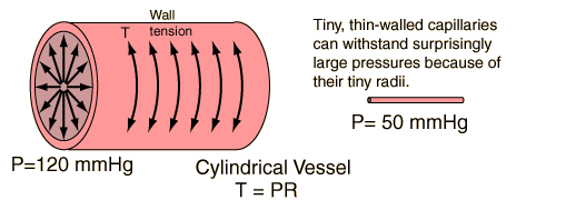 Capillary WallsThe walls of the capillaries of the human circulatory system are so thin as to appear transparent under a microscope, yet they withstand a pressure up to about half of the full blood pressure. LaPlace's law gives insight into how they are able to withstand such pressures: their small size implies that the wall tension for a given internal pressure is much smaller than that of the larger arteries. Given a peak blood pressure of about 120 mmHg at the left ventricle, the pressure at the beginning of the capillary system may be on the order of 50 mmHg. The large radii of the large arteries imply that for pressures in that range they must have strong walls to withstand the large resulting wall tension. The larger arteries provide much less resistance to flow than the smaller vessels according to Poiseuille's law, and thus the drop in pressure across them is only about half the total drop. The capillaries offer large resistances to flow, but don't require much strength in their walls. ![]() |