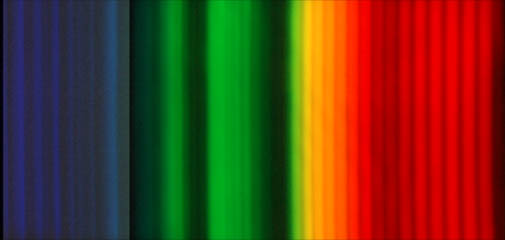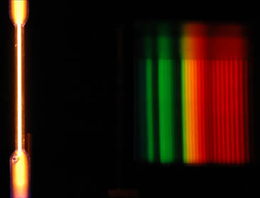 ![]() The nitrogen spectrum shown above shows distinct bands throughout the visible range. The blue lines in the above were brightened for greater visibility in the image. |