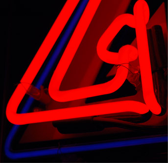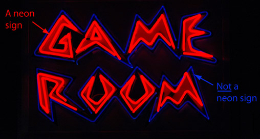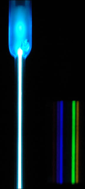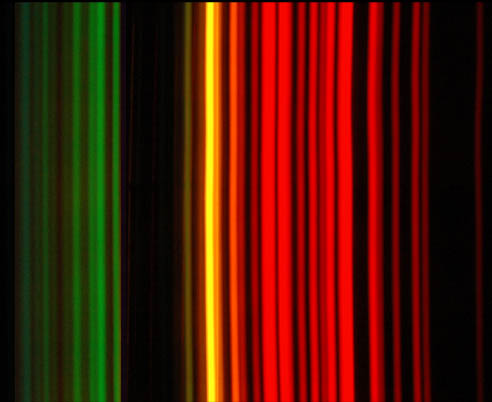 This is an attempt to give a reasonable accurate picture of the appearance of the neon spectrum, but both the images are composite images. The image below is composed of segments of three photographs to make the yellow and green lines more visible along with the much brighter red lines. Then the image below was reduced and superimposed on the image above, because with the exposure reasonable for the bright tube, only the red lines were visible on the photograph. ![]()