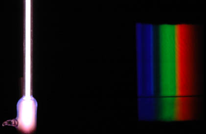 At left above is the spectral tube, excited by a 5000 volt transformer. At right is the spectrum seen through a 600 lines/mm diffraction grating. |