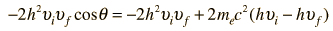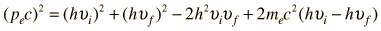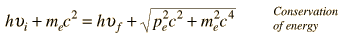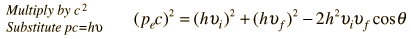 Compton Scattering Equation![]() In his explanation of the Compton scattering experiment, Arthur Compton treated the x-ray photons as particles and applied conservation of energy and conservation of momentum to the collision of a photon with a stationary electron. Using the Planck relationship and the relativistic energy expression, conservation of energy takes the form ![]() Conservation of momentum requires ![]() where p=E/c is used for the photon momentum. Squaring this equation using the scalar product gives ![]() Again using the Planck relationship and the relativistic energy expression: ![]() The energy conservation expression above can be squared to give ![]() These two forms can be equated to give ![]() which can be rearranged to ![]() and finally to the standard Compton formula: ![]()
