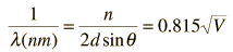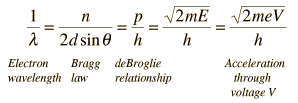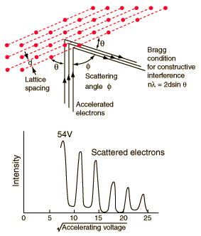 In the historical data, an accelerating voltage of 54 volts gave a definite peak at a scattering angle of 50°. The angle theta in the Bragg law corresponding to that scattering angle is 65°, and for that angle the calculated lattice spacing is 0.092 nm. For that lattice spacing and scattering angle, the relationship for wavelength as a function of voltage is empirically