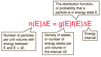 The Distribution of EnergyThe distribution of a fixed amount of energy among a number of identical particles depends upon the density of available energy states and the probability that a given state will be occupied. The probability that a given energy state will be occupied is given by the distribution function, but if there are more available energy states in a given energy interval, then that will give a greater weight to the probability for that energy interval. ![]()