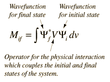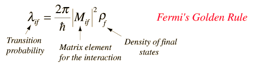 Transition Probabilities and Fermi's Golden RuleOne of the prominent failures of the Bohr model for atomic spectra was that it couldn't predict that one spectral line would be brighter than another. From the quantum theory came an explanation in terms of wavefunctions, and for situations where the transition probability is constant in time, it is usually expressed in a relationship called Fermi's golden rule. In general conceptual terms, a transition rate depends upon the strength of the coupling between the initial and final state of a system and upon the number of ways the transition can happen (i.e., the density of the final states). In many physical situations the transition probability is of the form ![]() The transition probability l is also called the decay probability and is related to the mean lifetime t of the state by l = 1/t. The general form of Fermi's golden rule can apply to atomic transitions, nuclear decay, scattering ... a large variety of physical transitions. A transition will proceed more rapidly if the coupling between the initial and final states is stronger. This coupling term is traditionally called the "matrix element" for the transition: this term comes from an alternative formulation of quantum mechanics in terms of matrices rather than the differential equations of the Schrodinger approach. The matrix element can be placed in the form of an integral where the interaction which causes the transition is expressed as a potential V which operates on the initial state wavefunction. The transition probability is proportional to the square of the integral of this interaction over all of the space appropriate to the problem. ![]() This kind of integral approach using the wavefunctions is of the same general form as that used to find the "expectation value" or expected average value of any physical variable in quantum mechanics. But in the case of an expectation value for a property like the system energy, the integral has the wavefunction representing the eigenstate of the system in both places in the integral. The transition probability is also proportional to the density of final states rf. It is reasonably common for the final state to be composed of several states with the same energy - such states are said to be "degenerate" states. This degeneracy is sometimes expressed as a "statistical weight" which will appear as a factor in the transition probability. In many cases there will be a continuum of final states, so that this density of final states is expressed as a function of energy. |