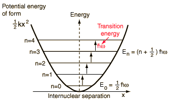The quantum harmonic oscillator is one of the foundation problems of quantum mechanics. It can be applied rather directly to the explanation of the vibration spectra of diatomic molecules, but has implications far beyond such simple systems. It is the foundation for the understanding of complex modes of vibration in larger molecules, the motion of atoms in a solid lattice, the theory of heat capacity, etc. In real systems, energy spacings are equal only for the lowest levels where the potential is a good approximation of the "mass on a spring" type harmonic potential. The anharmonic terms which appear in the potential for a diatomic molecule are useful for mapping the detailed potential of such systems. |