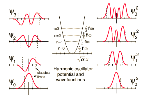 The Schrodinger equation for a harmonic oscillator may be solved to give the wavefunctions illustrated below.