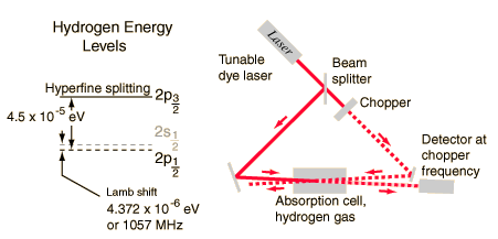 Tunable dye lasers are used to excellent advantage in "Doppler-free saturation spectroscopy" to minimize the effects of the Doppler broadening. The light from the laser is split into two beams, a saturating beam and a probe beam, arranged so that they cross in a region of a gas cell containing hydrogen gas. When the laser is tuned to a the frequency of an electron transition, the saturating beam is intense enough to deplete the lower level of the transition. The saturating beam is "chopped", or modulated, so that the saturation of the transiton is turned on an off. The probe beam is then absorbed, or not, depending on the whether the saturating beam is on. The probe beam strikes a sensitive detector, locked to the modulation frequency, which can then detect a signal at that frequency corresponding to the turning on and off of the absorption of the probe beam.