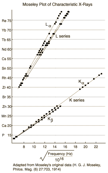 Moseley's Investigation of X-raysHenry G. J. Moseley (1887-1915) was described by Rutherford as his most talented student. When he was in his early 20's, he measured and plotted the x-ray frequencies for about 40 of the elements of the periodic table. He showed that the K-alpha x-rays followed a straight line when the atomic number Z versus the square root of frequency was plotted. His data (the Moseley plot) is still a standard feature of physics textbooks. At the time when he was working, most physicists regarded the atomic weight A as the key to ordering the periodic table, rather than the atomic number Z. For example, nickel, with atomic weight 58.7 was placed ahead of cobalt, atomic weight 58.9, in the periodic table. Moseley's work showed that cobalt had an atomic number of 27 and nickel 28. Potassium (Z=19, A=39.10) and Argon (Z=18, A=39.95) were also reversed when listed by atomic weight order. Moseley predicted the existence of an element at Z=72 (Hafnium) which was subsequently discovered in Bohr's laboratory in Copenhagen. Moseley volunteered for combat duty during World War I and was killed in action at age 27 during the attack on Gallipoli in the Dardenelles.