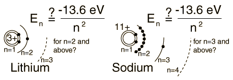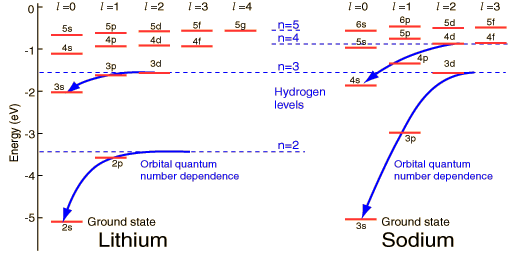 Hydrogen-like atoms such as lithium and sodium might be expected to exhibit similar energy levels. They consist of closed shells with a single electron outside. Envisioning a Bohr-type shell structure with just a single electron in the outer shell, the net charge inside that shell is just one net positive charge. This leads to the following expectation: ![]() However, when data from spectra are used to build energy level diagrams for these atoms, a strong orbital dependence of the energy is found for the electrons of low angular momentum as shown below. ![]() What is the origin of the orbital quantum number dependence? |
