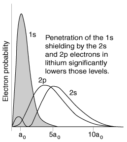 Origin of Orbital Quantum Number Dependence of Electron EnergiesWhen the wavefunctions for electrons with different orbital quantum numbers are examined, it is found that there is a different amount of penetration into the region occupied by the 1s electrons. This penetration of the shielding 1s electrons exposes them to more of the influence of the nucleus and causes them to be more tightly bound, lowering their associated energy states.