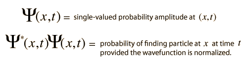 Probability in Quantum MechanicsThe wavefunction represents the probability amplitude for finding a particle at a given point in space at a given time. The actual probability of finding the particle is given by the product of the wavefunction with it's complex conjugate (like the square of the amplitude for a complex function). ![]() Since the probability must be = 1 for finding the particle somewhere, the wavefunction must be normalized. That is, the sum of the probabilities for all of space must be equal to one. This is expressed by the integral