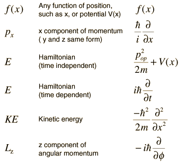 Operators in Quantum MechanicsAssociated with each measurable parameter in a physical system is a quantum mechanical operator. Such operators arise because in quantum mechanics you are describing nature with waves (the wavefunction) rather than with discrete particles whose motion and dymamics can be described with the deterministic equations of Newtonian physics. Part of the development of quantum mechanics is the establishment of the operators associated with the parameters needed to describe the system. Some of those operators are listed below. ![]() It is part of the basic structure of quantum mechanics that functions of position are unchanged in the Schrodinger equation, while momenta take the form of spatial derivatives. The Hamiltonian operator contains both time and space derivatives.