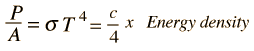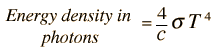 Radiation Energy DensityWhen the electromagnetic radiation in a region of space is at equilibrium with its surroundings, it can be described by the Planck radiation formula. The total energy radiated from an area in this region of space is given by the Stefan-Boltzmann law and the energy density associated with the radiation can be related to that law. In the development of the expression for the radiation from a hot surface, it was found that the radiated power is related to the energy density by the factor c/4 .