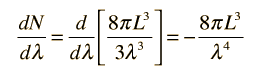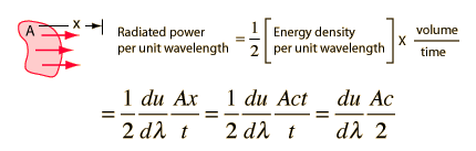 Radiated Energy as a Function of WavelengthIf we consider energy radiated perpendicular to a small increment of area, then it must be noted that half of the energy density in the waves is going toward the walls and half is coming out if the system is in thermal equilibrium. Evaluating the power seen at a given observation point requires a consideration of the geometry: For perpendicular radiated energy![]() but at an angle θ, the effective area will be Acosθ and the effective speed will be c cosθ, so the radiated energy will be reduced to ![]() For a given observation point near a radiating surface, the power will be the average power from all directions, and the average gives another factor of 1/2. Having averaged over all angles, the calculated radiated power per unit wavelength is finally ![]()
