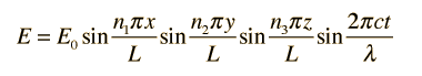 Electromagnetic Waves in a Cubical CavityElectromagnetic standing waves in a cavity at equilibrium with its surroundings cannot take just any path. They must satisfy the wave equation in three dimensions: ![]() The solution to the wave equation must give zero amplitude at the walls, since a non-zero value would dissipate energy and violate our supposition of equilibrium. To form a standing wave, the reflection path around the cavity must produce a closed path. The boundary conditions can be met with a solution of the form: ![]() Substituting this solution into the wave equation above gives ![]() which simplifies to ![]()