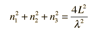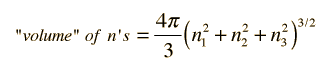 This has a couple of problems, however. In using a sphere, we have used both positive and negative values of n, whereas the wave equation solution uses only positive definite values. Therefore we must take 1/8 th of the volume above. Another technical problem is that you can have waves polarized in two perpendicular planes, so we must multiply by two to account for that. Then the volume can be taken to be a measure of the number of modes, becoming a very good approximation when the size of the cavity is much greater than the wavelength as in the case of electromagnetic waves in finite cavity. Using the relation obtained for the values of n, this becomes ![]()